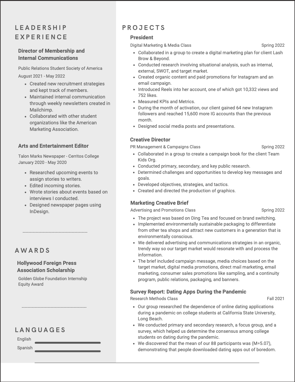 Hello my name is Rocio Valdez. I am a Public Relations major and Marketing minor undergrad from CSULB with an Associate of Arts degree in Journalism. Thank you for taking time to get to know more about me. I am honored to let you know about myself and showcase my work, skills and passion. I hope that you find my portfolio interesting and get a sense of my personality and story as you explore my website.